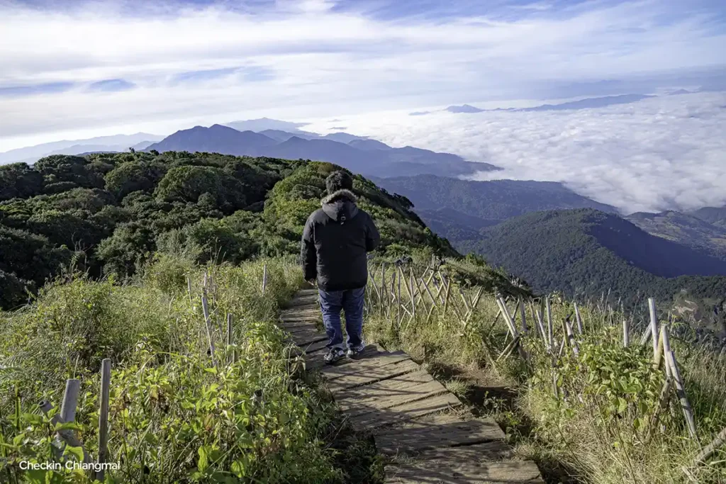 2. ทุ่งหญ้ากึ่งอัลไพร์น (Sub-Alpine Meadow): เมื่อเดินพ้นป่าทึบออกมา จะพบกับทุ่งหญ้าโล่งกว้างขนาดใหญ่ ทุ่งหญ้าจะเปลี่ยนสีตามฤดูกาล (สีเขียวในหน้าฝน, สีน้ำตาลทองในหน้าหนาว) จุดนี้คือไฮไลท์สำหรับชมทะเลหมอกและเมฆไหล