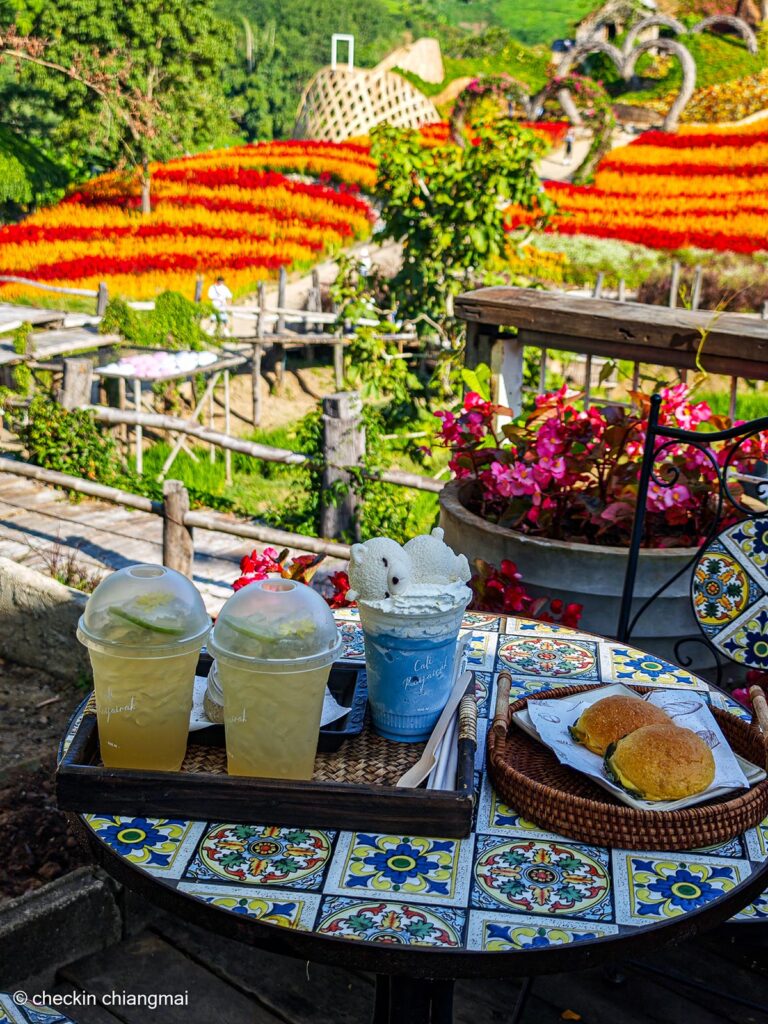 ที่นี่มีคาเฟ่ที่ไม่ธรรมดาครับ เสิร์ฟเมนูโฮมเมดอย่าง Cloud Bear Smoothie สีพาสเทลน่ารัก และ ขนมปังฟักทองญี่ปุ่น หอมนุ่มละมุน รสชาติอร่อยถูกปากครับ พร้อมมีงานทำมือจากชาวบ้านให้เลือกช้อปกลับบ้าน อิ่มท้อง อิ่มใจ และสนับสนุนชุมชนไปพร้อมกัน โดยมีการจัดมุมให้เราสามารถไปนั่งชิลจิบเครื่องดื่มเย็นๆ นั่งกินขนมปังร้อนๆ สูตรของร้าน ไม่ว่าจะเป็นมุมในส่วนหย่อมที่มีการเปิดหมอกจำลองเป็นระยะ หรือจะไปนั่งบนตะแกรง ดูน้องปลาแหวกว่ายอยู่ในบ่อ